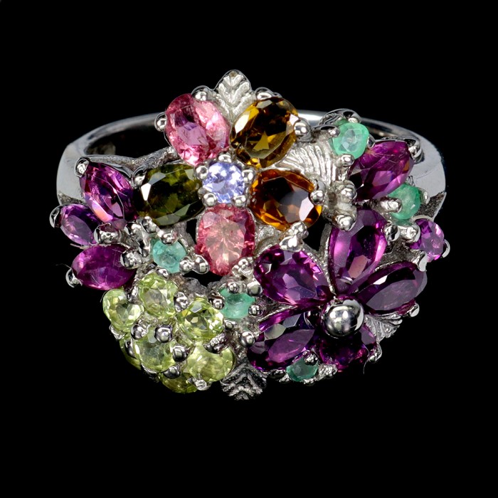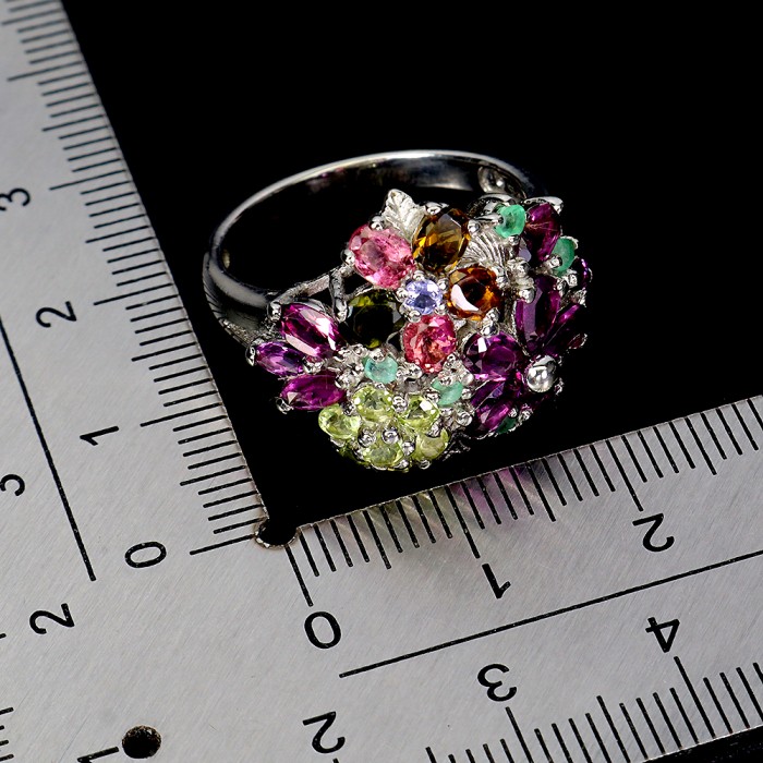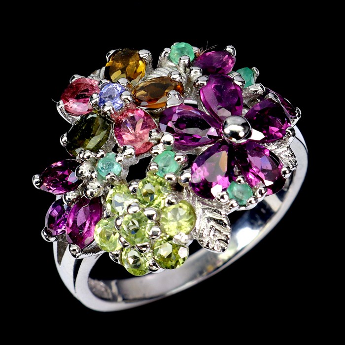 К6093Natural Peridot, Rhodolite Garnet 28.0 X 16.0 MM.Розмір 18.5.Вага 7.63 гр.Срібло 925 проби покрите білим золотом.Розмір каміння - 3.0 TO 6.0 X 4.0 MM.Чистота - If To Vvs.Обробка - Unheated.Походження - Pakistan...