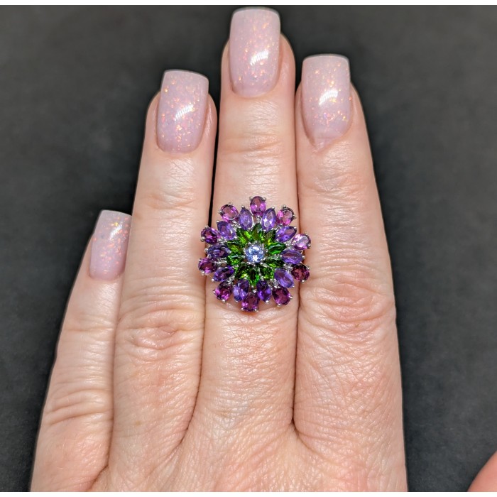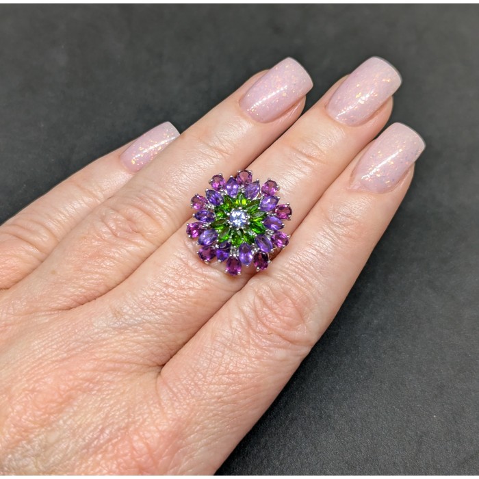 К5767Natural Amethyst, Emerald, Rhodolite Garnet 23.0 X 21.0 MM.Розмір 19.Вага 5.32 гр.Срібло 925 проби покрите білим золотом.Розмір каміння - 1.0 TO 5.0 X 3.0 MM. Чистота - If To Vvs.Обробка - Unheated.Походження - Uruguay...