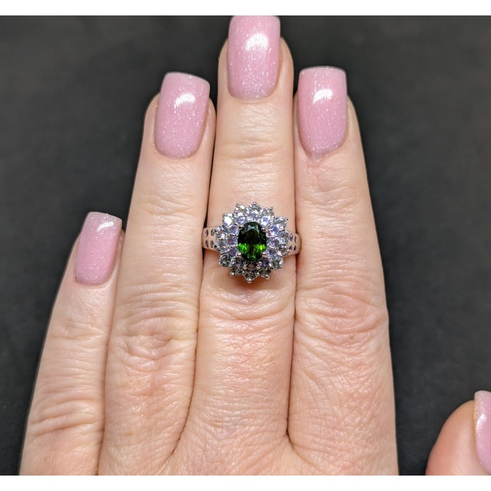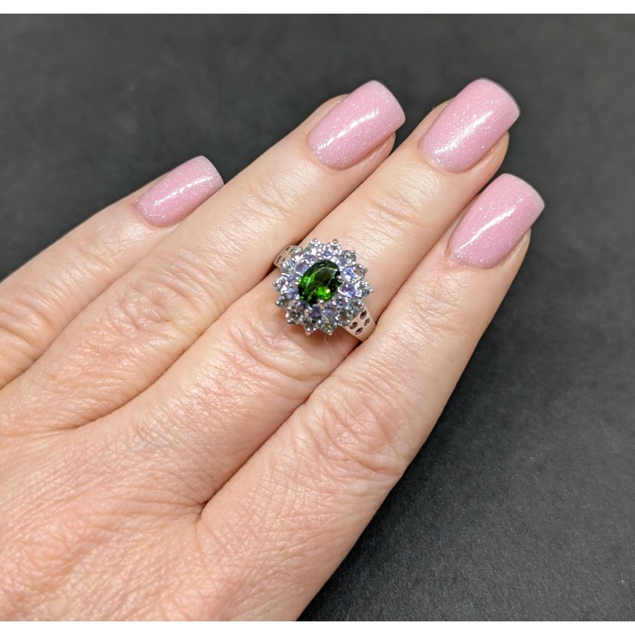 К6075Natural Aquamarine, Chrome Diopside, Emerald, Sapphire 20.0 X 11.0 MM.Розмір 19.Вага 3.4 гр.Срібло 925 проби покрите білим золотом.Розмір каміння - 1.0 TO 5.0 X 4.0 MM.Чистота - If To Vvs.Обробка - Unheated.Походження - Brazil...