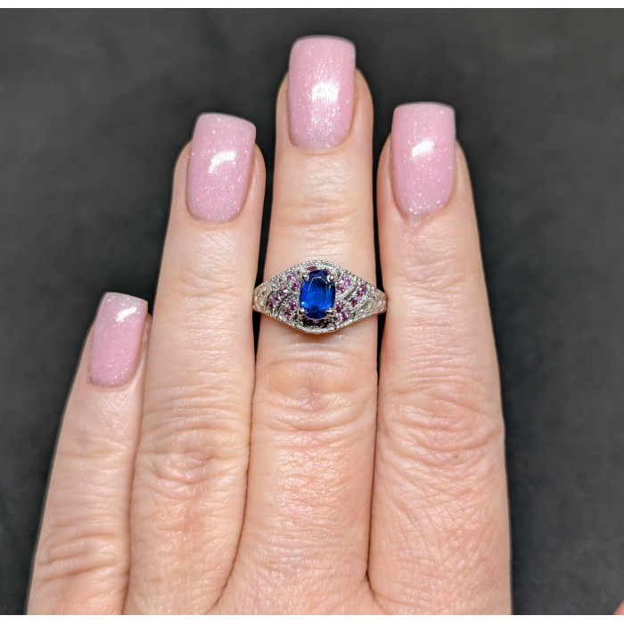 С6111Natural Sapphire, White Topaz 14.0 X 10.0 MM.Вага 3.5 гр.Срібло 925 проби покрите білим золотом.Розмір каміння - 1.0 MM.Чистота - If.Обробка - Heated.Походження - Africa...