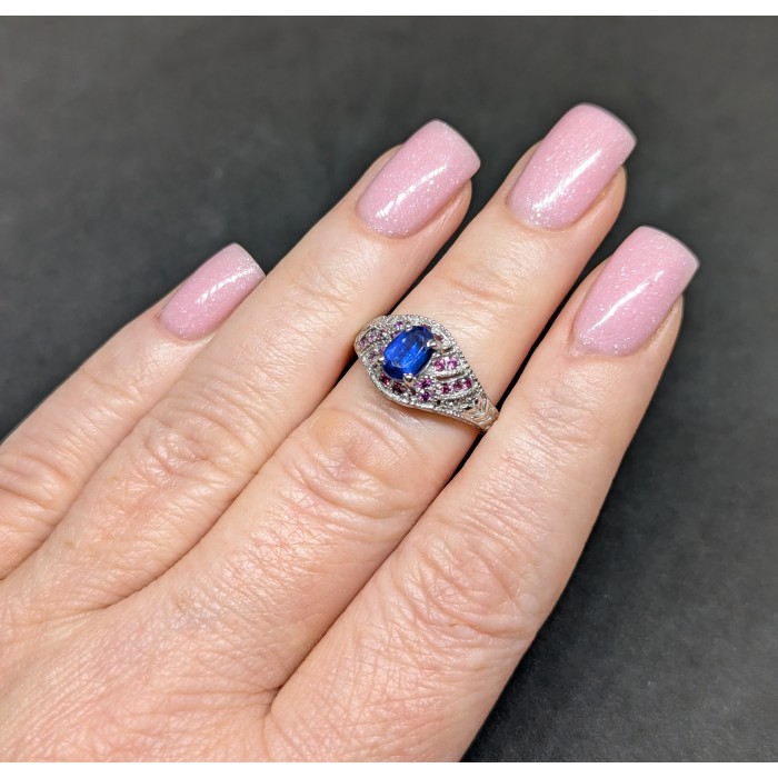 К6009Natural Kyanite, Rhodolite Garnet 21.0 X 7.0 MM.Розмір 17.1.Вага 2.25 гр.Срібло 925 проби покрите білим золотом.Розмір каміння - 1.5 TO 6.0 X 4.0 MM. Чистота - If To Vvs.Обробка - Unheated.Походження - Nepal...