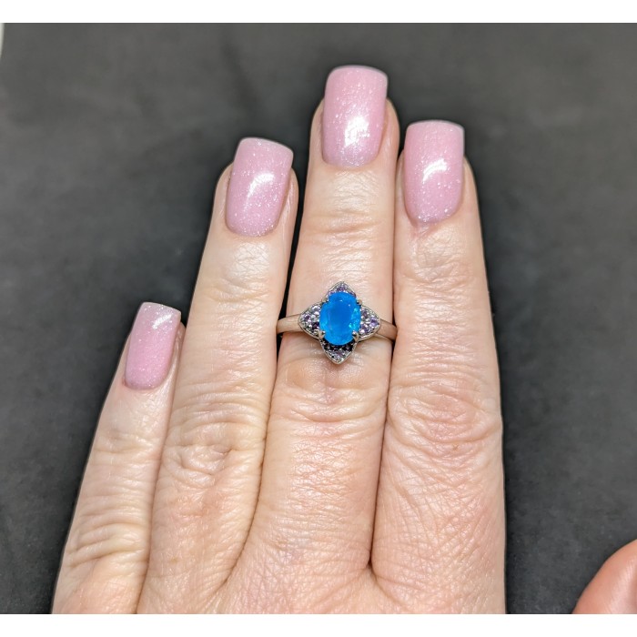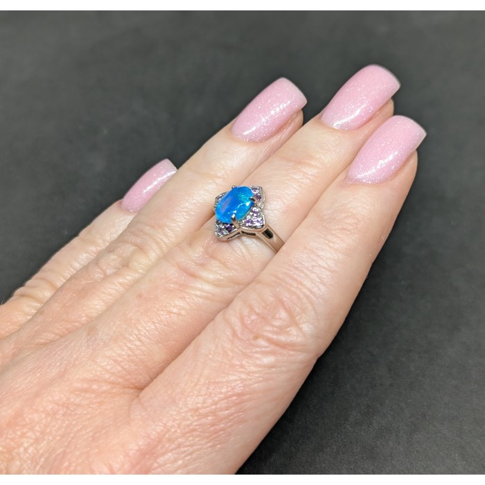 К5765Natural Blue Opal, Aquamarine, Rhodolite Garnet 17.0 X 16.0 MM.Розмір 18.2.Вага 4.18 гр.Срібло 925 проби покрите білим золотом.Розмір каміння - 1.5 TO 7.0 X 5.0 MM.Чистота - If.Обробка - Clarity Enhanced.Походження - Ethiopia...