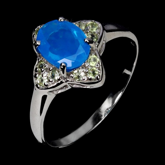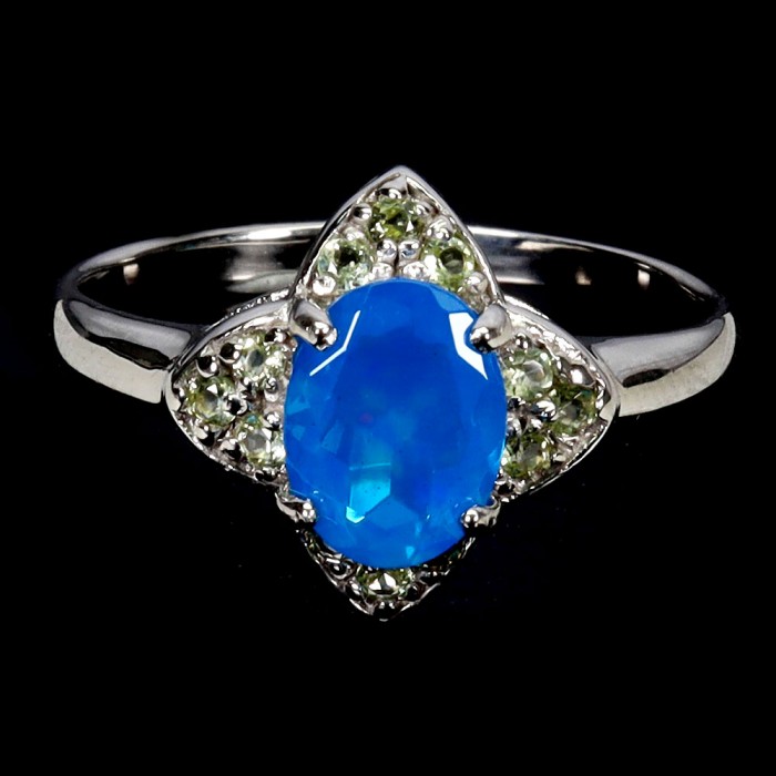 К6070Natural Fire Opal, Chrome Diopside 19.0 X 11.0 MM.Розмір 17.35.Вага 2.03 гр.Срібло 925 проби покрите білим золотом.Розмір каміння - 1.0 TO 8.0 X 6.0 MM.Чистота - If.Обробка - Unheated.Походження - Ethiopia...
