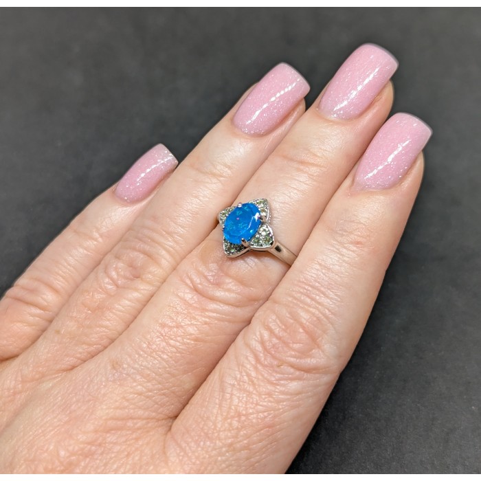 К5989Natural Blue Opal, Amethyst 13.0 X 13.0 MM.Розмір 18.2.Вага 2.09 гр.Срібло 925 проби покрите білим золотом.Розмір каміння - 1.5 TO 8.0 X 6.0 MM. Чистота - If.Обробка - Clarity Enhanced.Походження - Ethiopia...