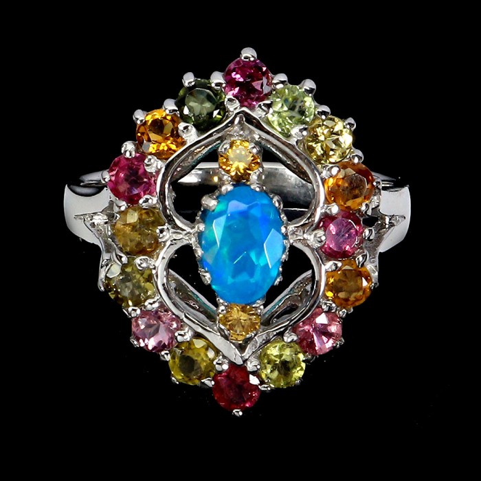 К4424Natural Tourmaline, Spinel 21.0 X 18.0 MM.Розмір 17.35.Вага 4.77 гр.Срібло 925 проби покрите білим золотом.Розмір каміння - 1.0 TO 7.0 X 5.0 MM.Чистота - If To Vvs.Обробка - Unheated.Походження - Brazil...