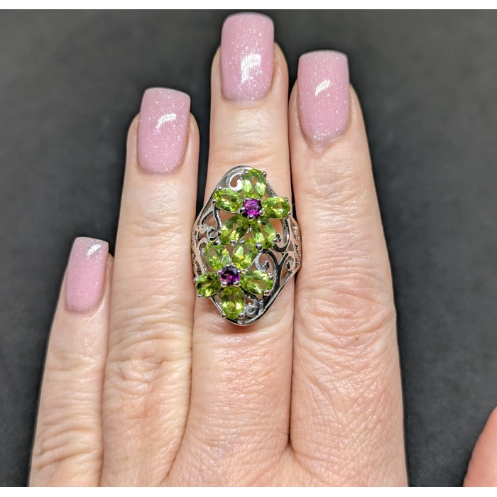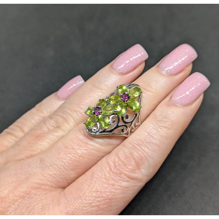 К5748Natural Emerald, Rhodolite Garnet 21.0 X 14.0 MM.Розмір 17.6.Вага 6.49 гр.Срібло 925 проби покрите білим золотом.Розмір каміння - 1.0 TO 6.0 X 4.0 MM.Чистота - Transparent.Обробка - Unheated.Походження - Brazil...