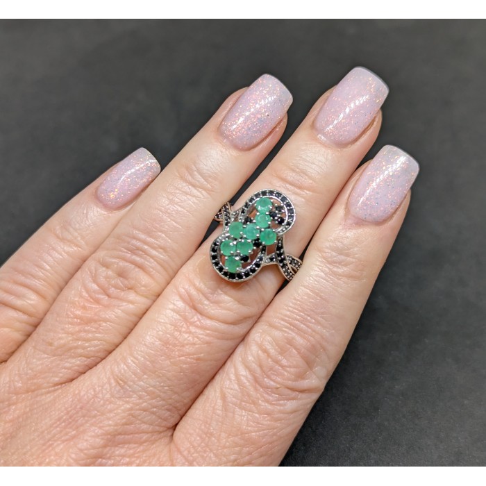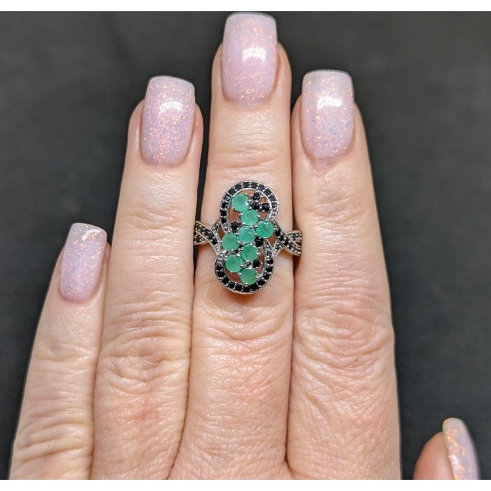 К5424Natural Emerald, Black Spinel, Cz 19.0 X 9.0 MM.Розмір 17.5.Вага 2.64 гр.Срібло 925 проби покрите білим золотом.Розмір каміння - 1.5 TO 7.0 X 5.0 MM. Чистота - Transparent.Обробка - Unheated.Походження - Brazil...