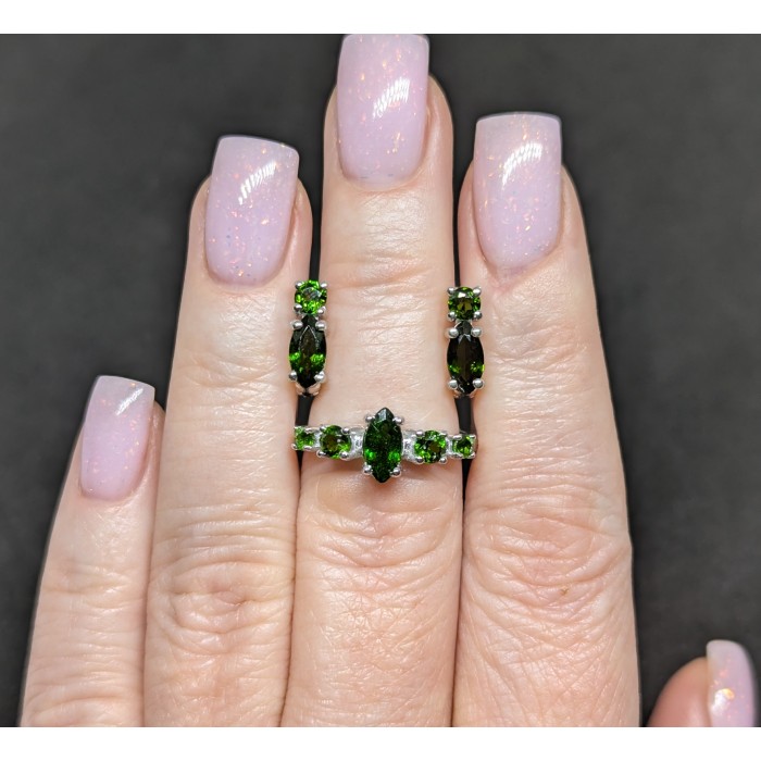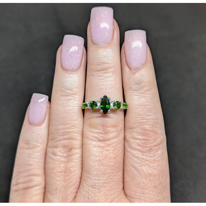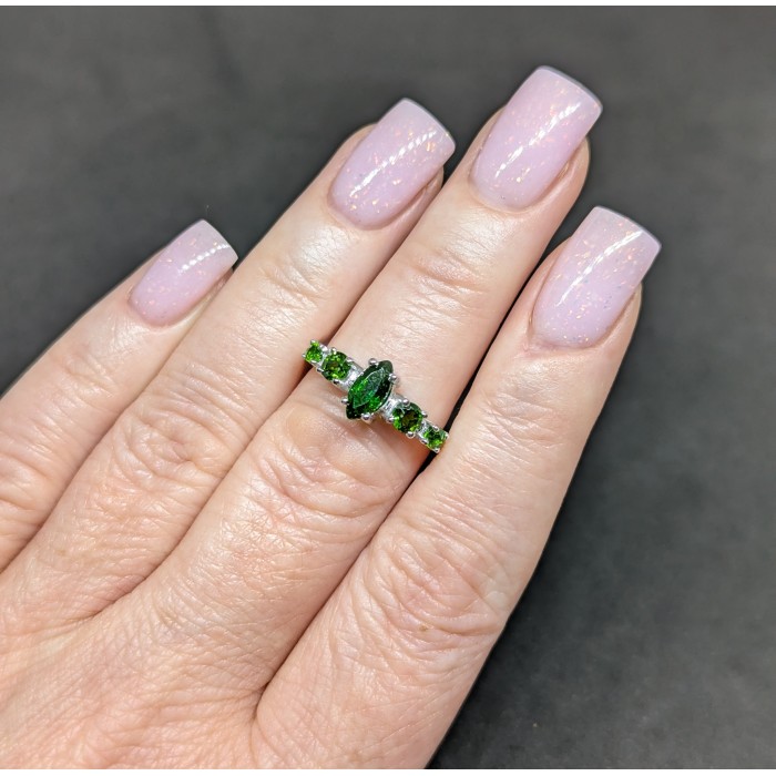 К4596Natural Chrome Diopside & White Zircon 7 x 12.6 mm.Розмір 17.35.Вага 2,88 гр.Срібло 925 проби покрите білим золотом.Розмір каміння - 6 x 8 - 1.1 mm.Чистота - IF TO VVS.Обробка - UNHEATED.Походження - RUSSIA...