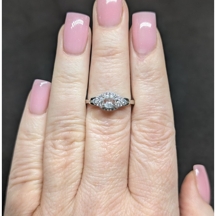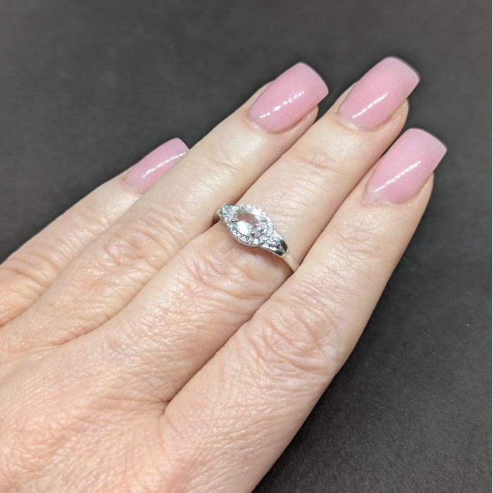 К6405Natural Morganite Cz 9.0 X 7.0 MM.Розмір 16.5.Вага 2.01 гр.Срібло 925 проби покрите білим золотом.Розмір каміння - 7.0 X 5.0 MM., CZ 1.0 MM.Чистота - If To Vvs.Обробка - Unheated.Походження - Madagascar...