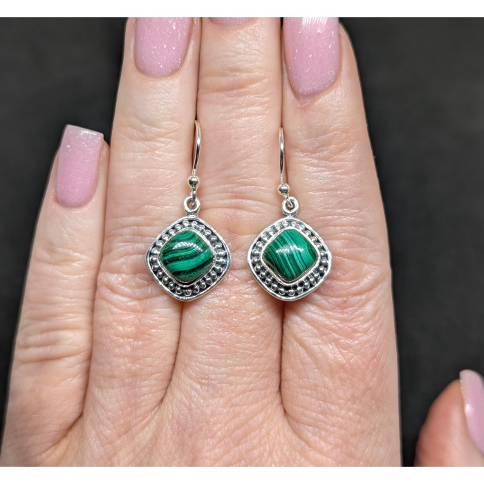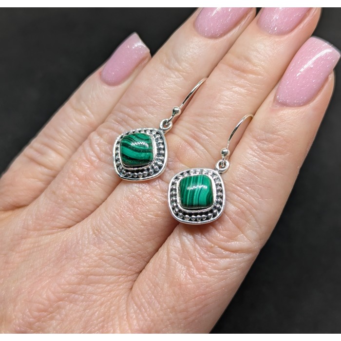 С6107Natural Malachite 31.0 X 12.0 MM.Вага 4.51 гр.Срібло 925 проби покрите білим золотом.Розмір каміння - 10.0 X 8.0 MM.Чистота - Opaque.Обробка - Unheated.Походження - Afghanistan...