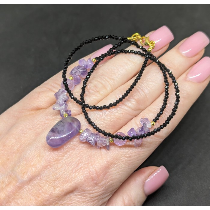 Natural Purple Amethyst, Black Spinel & Beads 470.0 Х 432.0 Х90.0 Х 20.0 ММ.