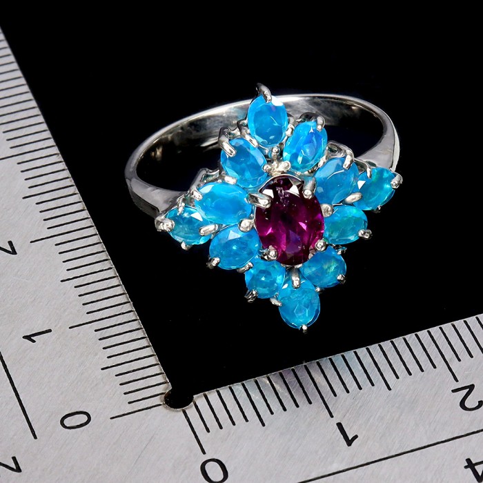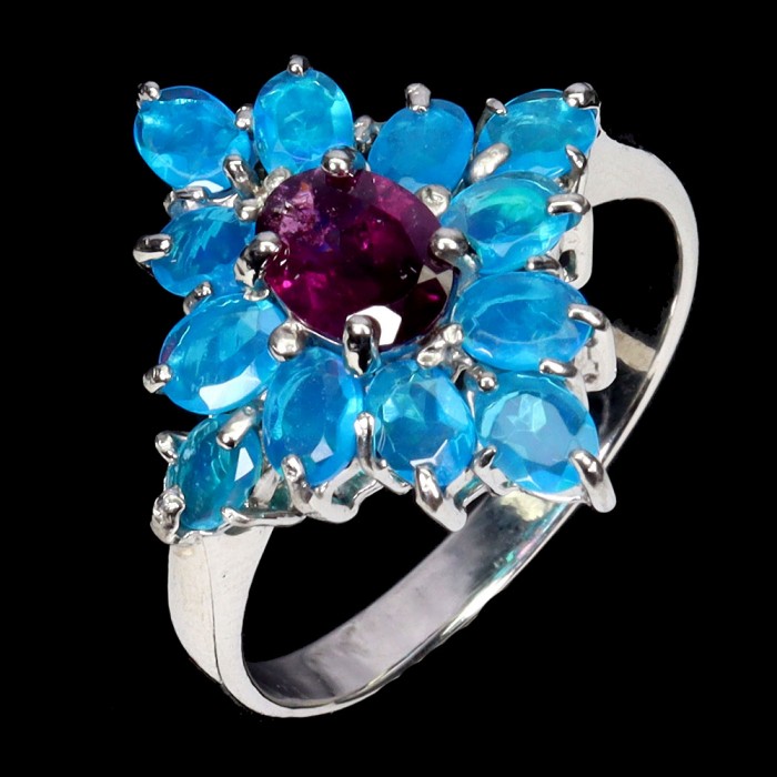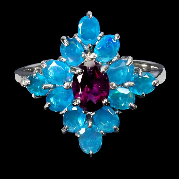 К6148Natural Blue Opal, Rhodolite Garnet 23.0 X 18.0 MM.Розмір 19.Вага 6.57 гр.Срібло 925 проби покрите білим золотом.Розмір каміння - 1.0 TO 9.0 X 7.0 MM.Чистота - If.Обробка - Clarity Enhanced.Походження - Ethiopia...