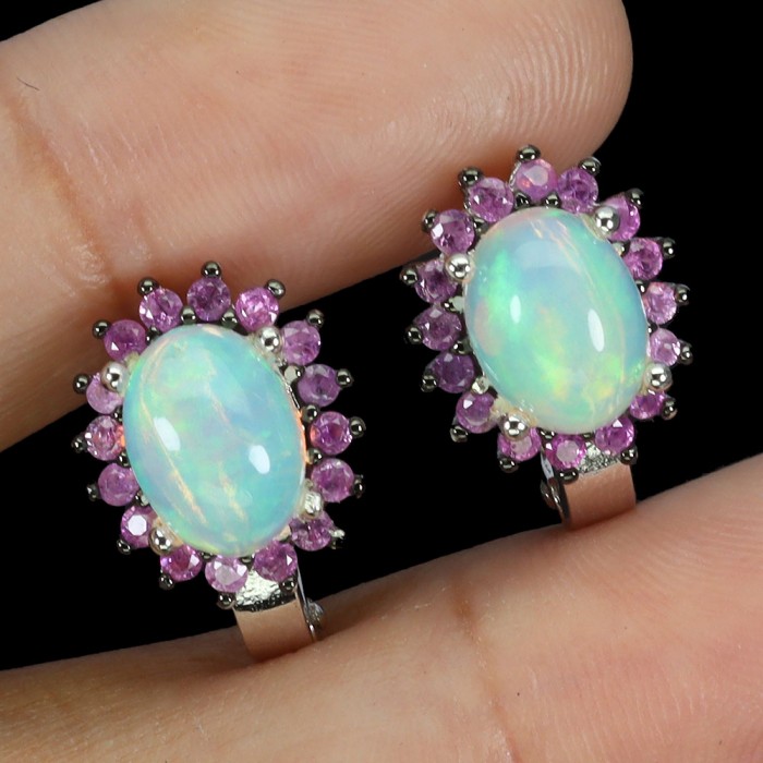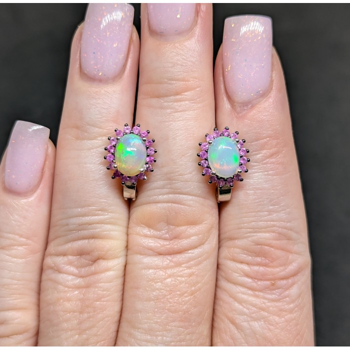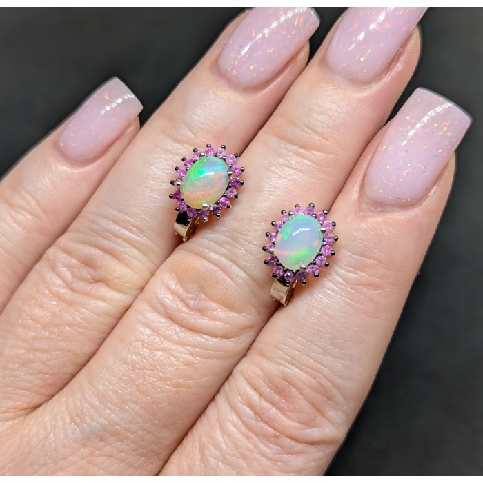 С6123Natural Fire Opal, Sapphire 14.0 X 10.0 MM.Вага 4.1 гр.Срібло 925 проби покрите білим золотом.Розмір каміння - 1.5 TO 8.0 X 6.0 MM.Чистота - If.Обробка - Unheated.Походження - Ethiopia...