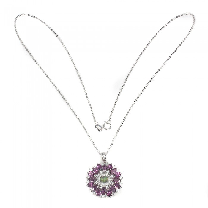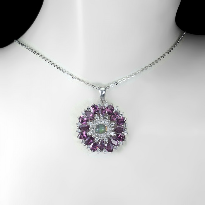 К6619Natural Blue Opal, Amethyst, Chrome Diopside, Rhodolite Garnet 23.0 X13.0 MM.Розмір 18.2.Вага 3.98 гр.Срібло 925 проби покрите білим золотом.Розмір каміння - 2.5 TO 6.0 X 4.0 MM. Чистота - If.Обробка - Clarity Enhanced.Походження - Ethiopia...