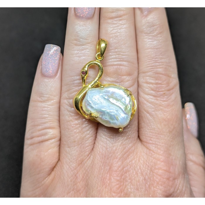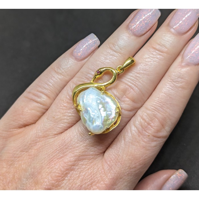 П5775Natural Pearl, Ruby 26.0 X 15.0 MM.Вага 5.18 гр.Срібло 925 проби покрите жовтим золотом.Розмір каміння - 2.0 MM., PEARL 18.0 X 13.0 MM.Чистота - Transparent.Обробка - Heated.Походження - Myanmar...