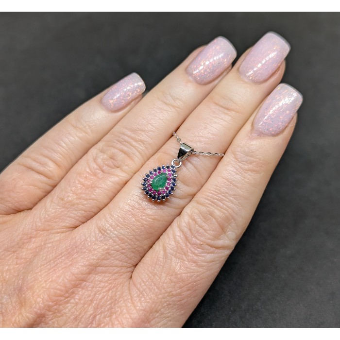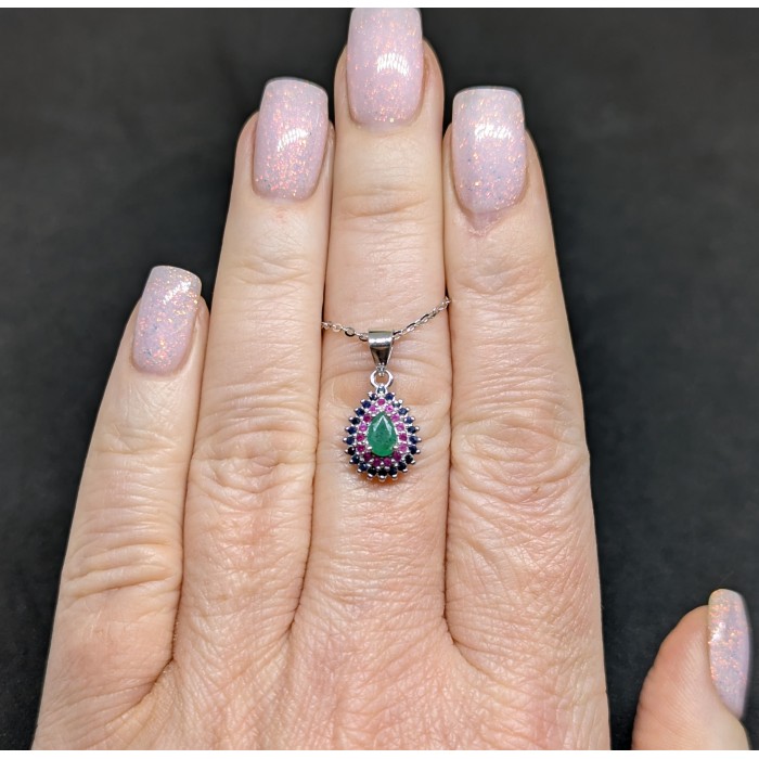 П5466Natural Emerald, Sapphire, Ruby 450.0 Х 9.0 Х 20 0 ММ.Вага 2.06 гр.Срібло 925 проби покрите білим золотом.Розмір каміння - 1.0 TO 6.0 X 4.0 MM.Чистота - Transparent.Обробка - Unheated.Походження - Brazil...