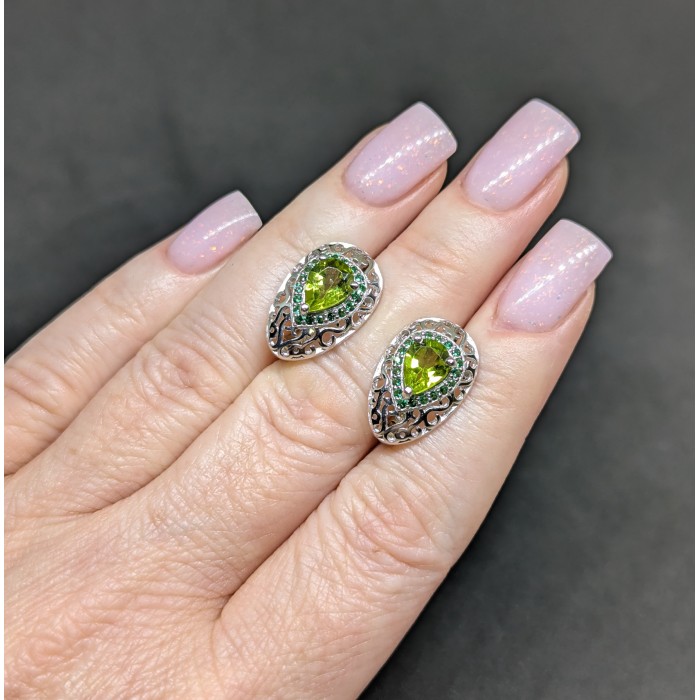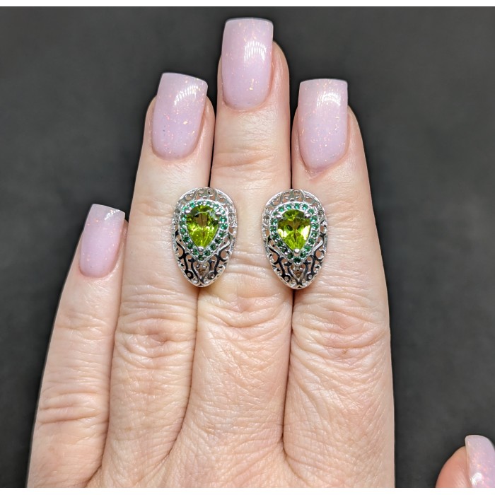 С4765Natural Peridot Cz 32.0 X 9.0 MM.Вага 4.87 гр.Срібло 925 проби покрите білим золотом.Розмір каміння - 9.0 X 7.0 MM., CZ 1.0 MM.Чистота - If To Vvs.Обробка - Unheated.Походження - Pakistan...