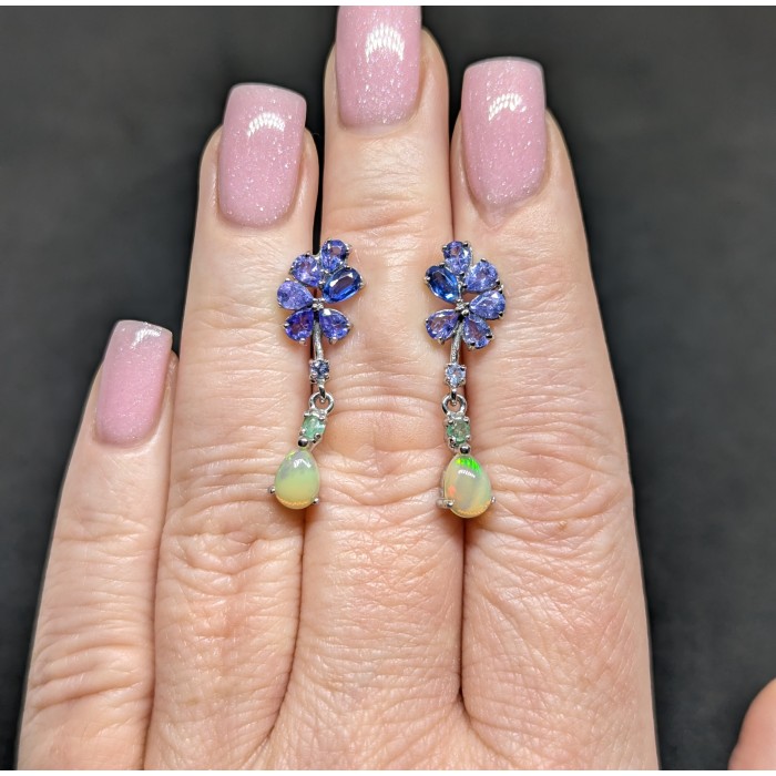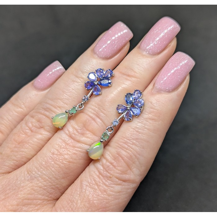 С6077Natural Black Opal, Emerald, Sapphire, Tanzanite 27.0 X 11.0 MM.Вага 3.72 гр.Срібло 925 проби покрите білим золотом.Розмір каміння - 2.0 TO 7.0 X 5.0 MM.Чистота - If.Обробка - Clarity Enhanced.Походження - Ethiopia...