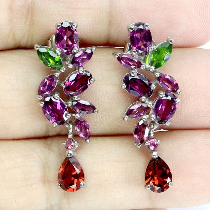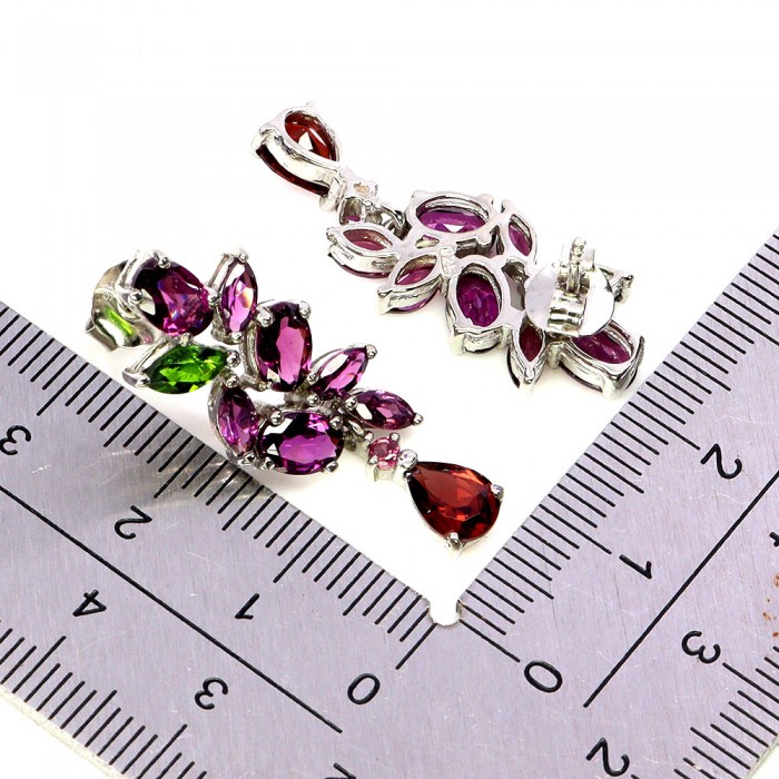 С6381Natural Rhodolite Garnet, Tourmaline, Cz 19.0 X 7.0 MM.Вага 6.11 гр.Срібло 925 проби покрите білим золотом.Розмір каміння - 4.0 X 3.0 TO 5.0 X 2.5 MM., CZ 1.0 MM.Чистота - If To Vvs.Обробка - Unheated.Походження - Africa...