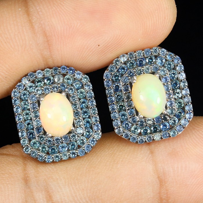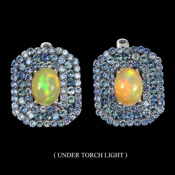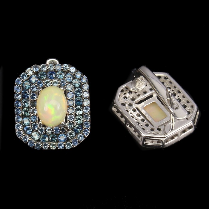 С6167Natural Fire Opal, Sapphire 13.0 X 10.0 MM.Вага 4.16 гр.Срібло 925 проби покрите білим золотом.Розмір каміння - 1.0 TO 10.0 X 8.0 MM.Чистота - If.Обробка - Unheated.Походження - Ethiopia...