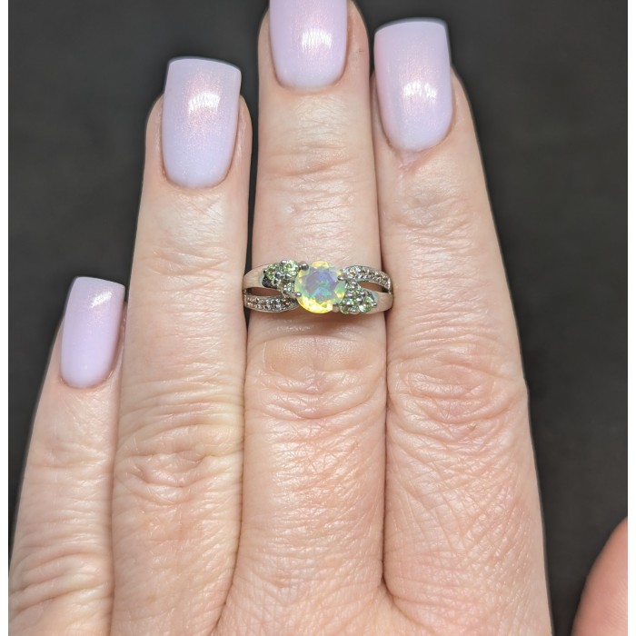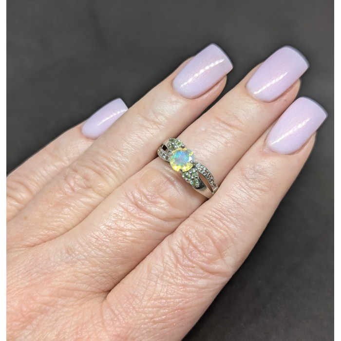 К6466Natural Orange opal, Chrome Diopside, Peridot 16.0 X 14.0 MM.Розмір 18.Вага 2.12 гр.Срібло 925 проби покрите білим золотом.Розмір каміння - 2.0 TO 8.0 X 6.0 MM.Чистота - If.Обробка - Clarity Enhanced.Походження - Ethiopia...