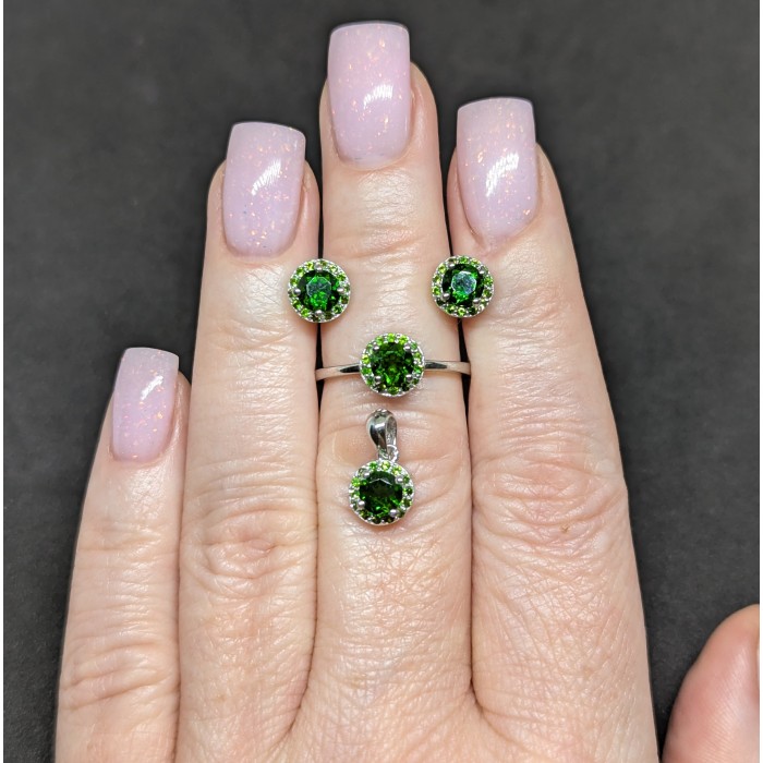 С6141Natural Green Chrome Diopside 4.3 x 11.8 mm.Вага 2,74 гр.Срібло 925 проби покрите білим золотом.Розмір каміння - 4.0 x 8.0 - 3.0 mm.Чистота - IF TO VVS.Обробка - UNHEATED.Походження - RUSSIA...